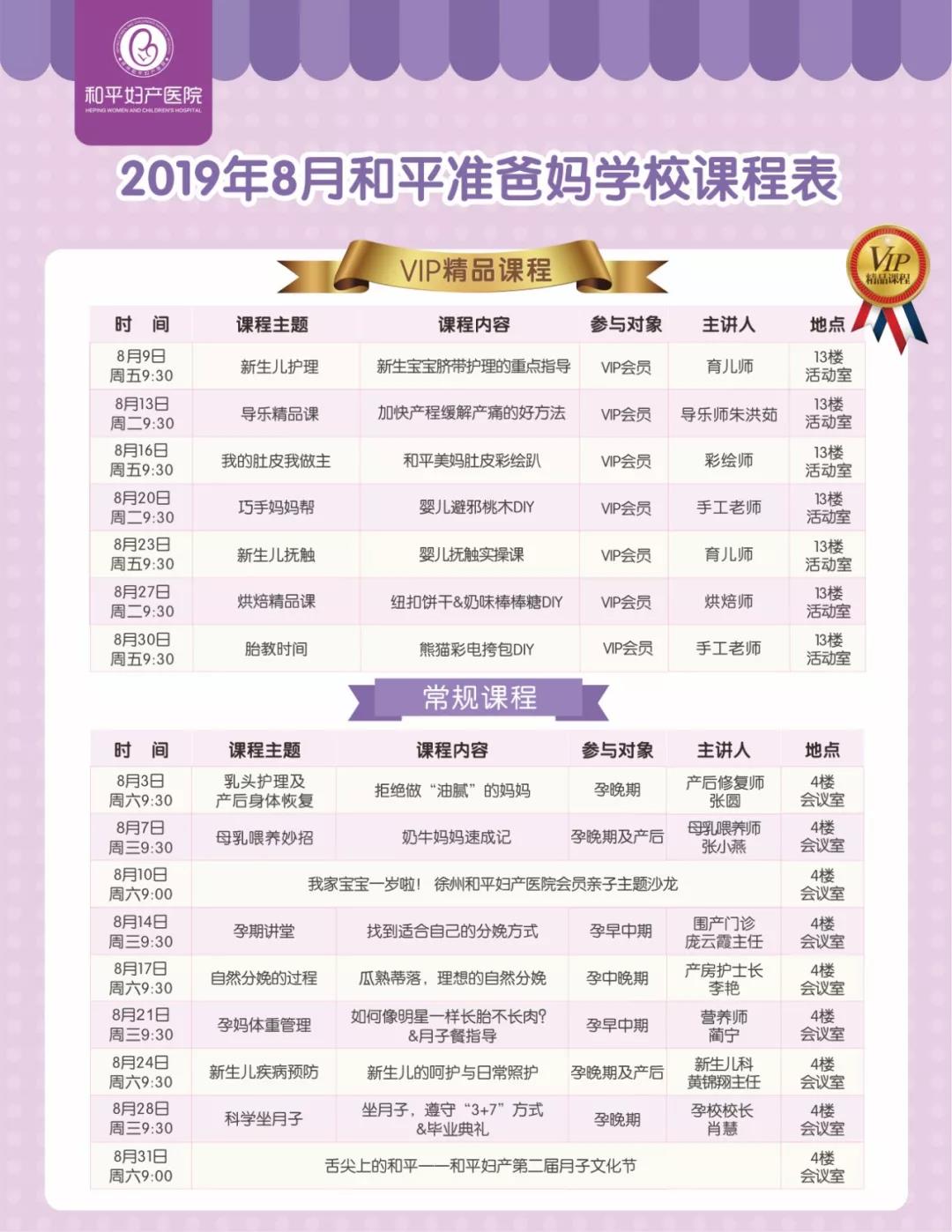 和平准爸妈学校除了常规课程以外,还特别开设VIP精品课程,涵盖从孕期到产后的保健、胎教、分娩、新生儿护理等基础孕产育知识,同时,还有孕期瑜伽、分娩阵痛体验、游戏互动、精美手工、美味烘焙、月子餐品鉴等趣味课程。以丰富多样的教学方式解决准爸妈们最关心的问题,给予最专业的指导,同时还能丰富准妈妈们的孕期生活,武装你的头脑,让宝宝赢在起跑线!