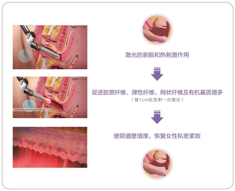 菲蜜丽与治疗面部的激光类似,通过微剥脱和热刺激使组织再生。目前有数以百万计的妇女因分娩、年龄增长或其它原因而遭受阴道畸形和结构变化的折磨,导致包括疼痛、瘙痒和下垂等多种症状的发生,使阴道健康度下降,极易诱发阴道疾病,影响到女性正常生活。