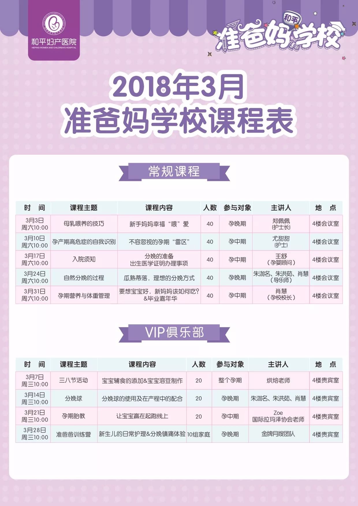 2. VIP俱乐部课程仅限和平VIP俱乐部会员(已在我院预约分娩)免费参与,瑜伽课程不参与积分。