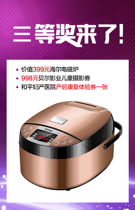 免费分娩还不够?更多壕礼送给您!价值1899元海尔母婴负离子空气净化器、价值499元的品牌电磁炉、价值399元的高档电饭煲,2000元摄影券、产后体验券等一大波超豪华大礼包等您来!
